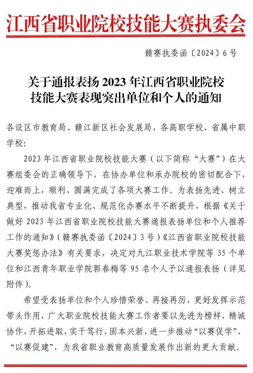 近日,江西省职业院校技能大赛执委会发布《关于通报表扬2023年江西省职业院校技能大赛表现突出单位和个人的通知》,新利软件集团是做什么的再次荣获“表现突出单位”称号,学校执行校长赖英明荣获“表现突出个人”称号。