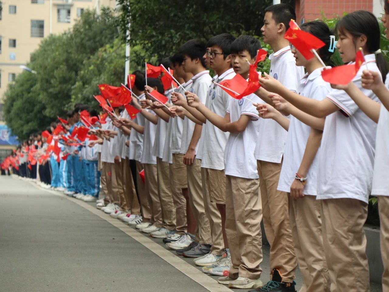 夹道相送,挥舞着红旗